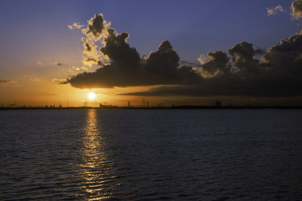 Sunset on Burnet Bay on March 13, 2022 – Unusual to have cloud cover at the horizon with a gap and then clouds above – The photo captures the sun setting in this gap in the clouds with the Houston skyline below the sun. It looked like the evil eye of Sauron from the Lord of the Rings…. The “black dots” to the left of the sun are seagulls.