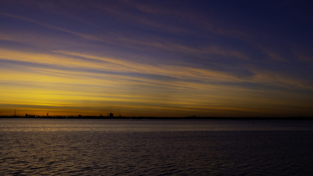 Sunset on Burnet Bay March 9, 2022: Sun peaked below the layer of clouds before sunset and heads down just to the left of the Houston skyline.